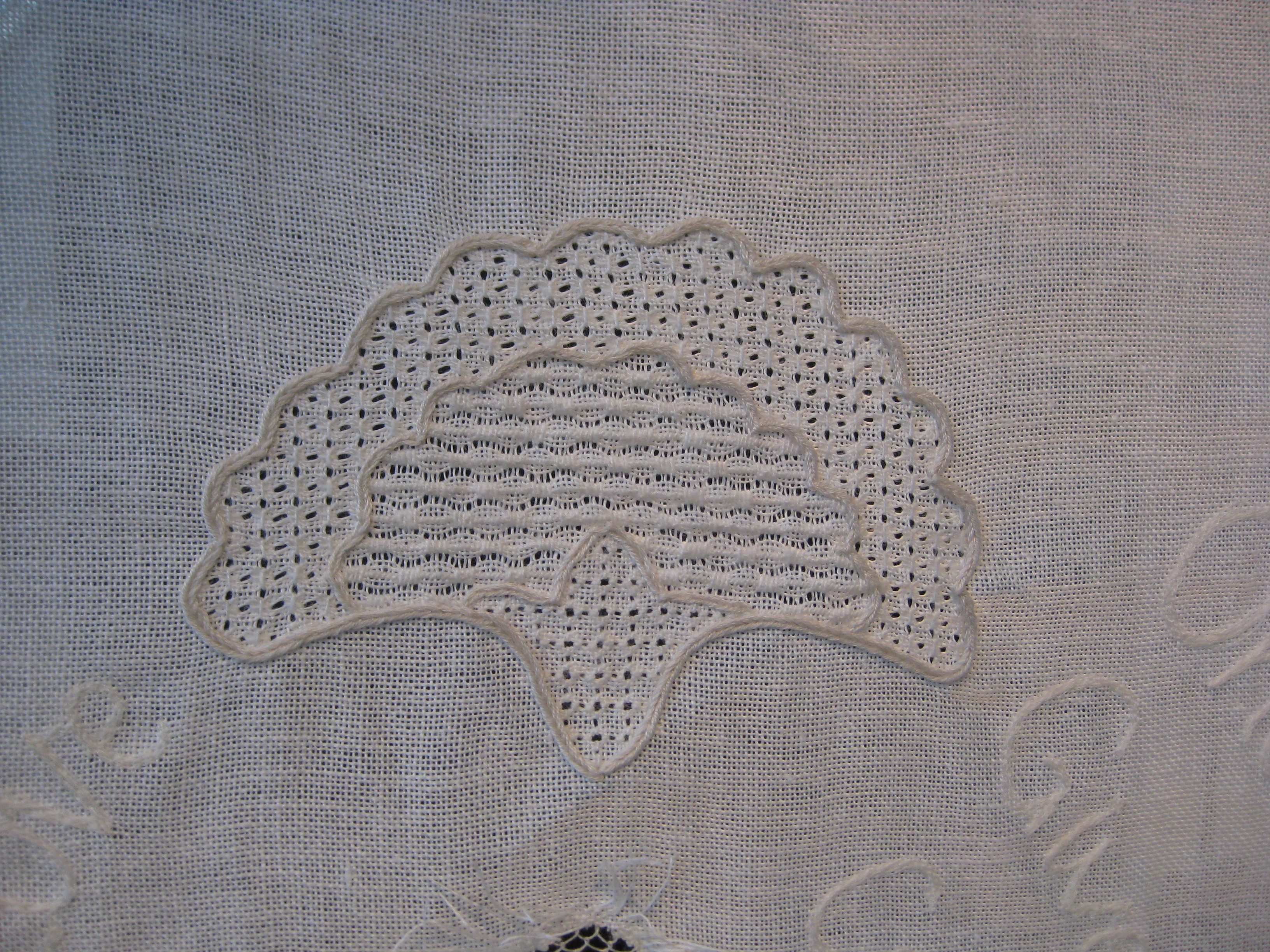 White wall hanging Wall hanging with embroidery (Photo by Anders Trærup and Kristian Appelon) Detail: Flower in pulled thread embroidery